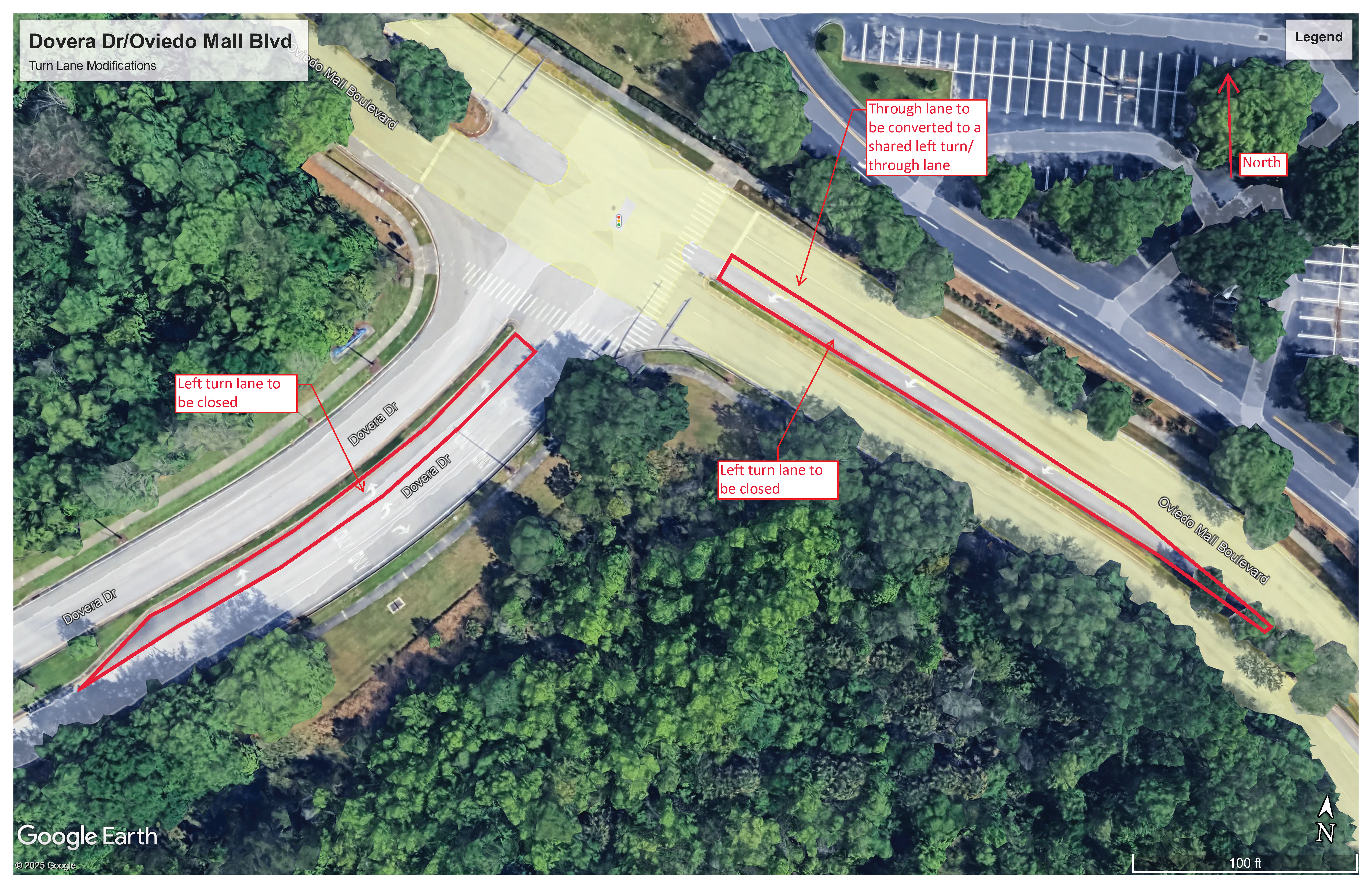 On the evening of January 7, the City will have two contractors make some additional modifications at the intersection of Dovera Dr and Oviedo Mall Blvd. Attached is a graphic that shows the modifications. Here is a summary of the modifications: